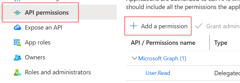 Open API permissions under Manage and click on Add a permission: