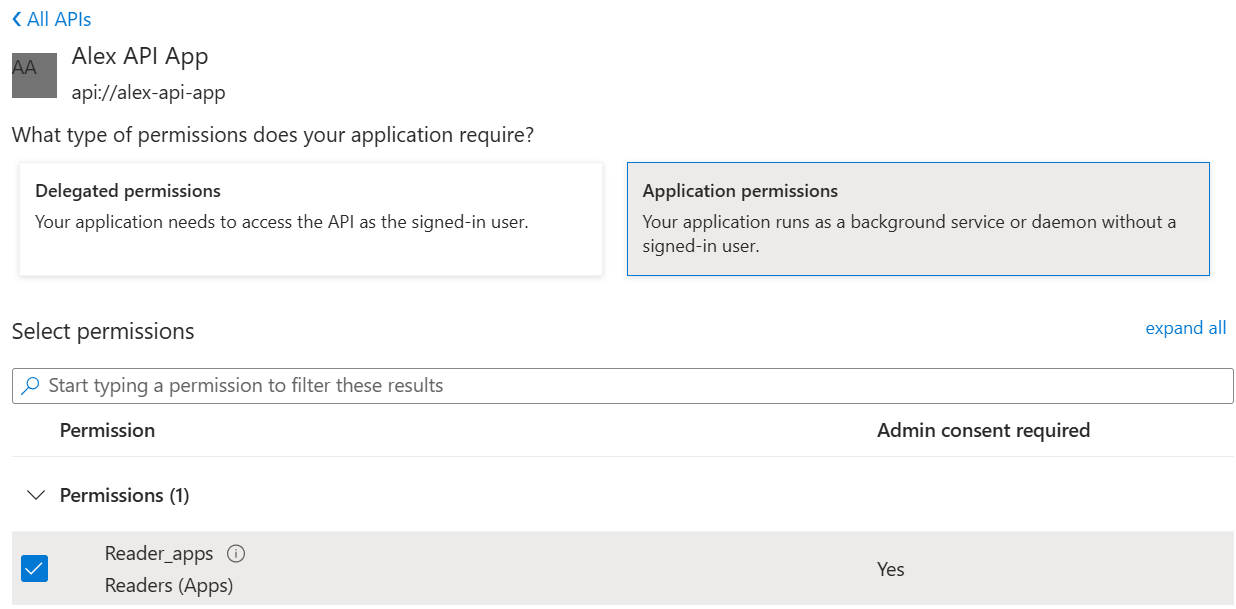 You will be presented with a new choice: Delegated permissions or Application permissions. Since we want to assign the roles that the API exposes for apps only, we choose Application permissions. From there we check the roles that we want to receive: