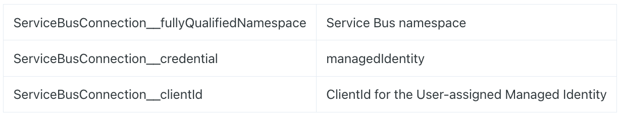 ServiceBusConnection__credential(«managedIdentity»)ServiceBusConnection__clientId(ClientId for the User-assigned Managed Identity)