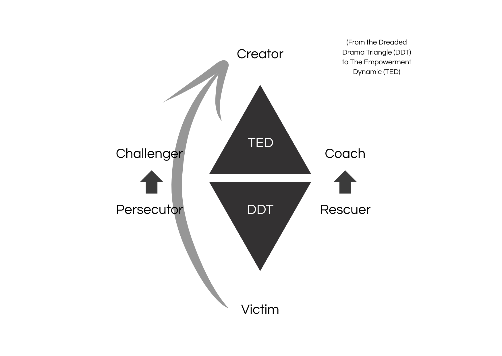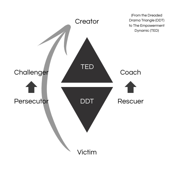 Motstykket til Drama Triangelet finner vi i The Empowerment Dynamic (TED) av David Emerald. Gjennom TED kan vi finne mønstre som hjelper oss å ta eierskap og skape trygghet for å jobbe sammen på en mer konstruktiv måte.