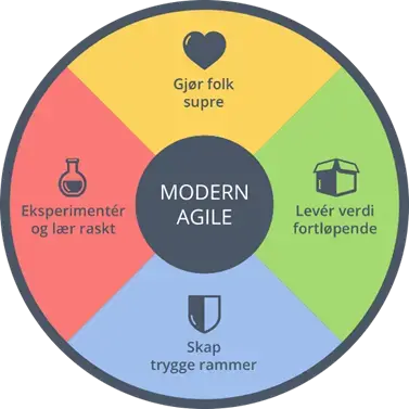 Hvordan skaper vi da engasjement og gjør strategien til et verktøy for endring?  Her kommer Moderne Smidig (Modern Agile) inn med sine 4 enkle prinsipper.